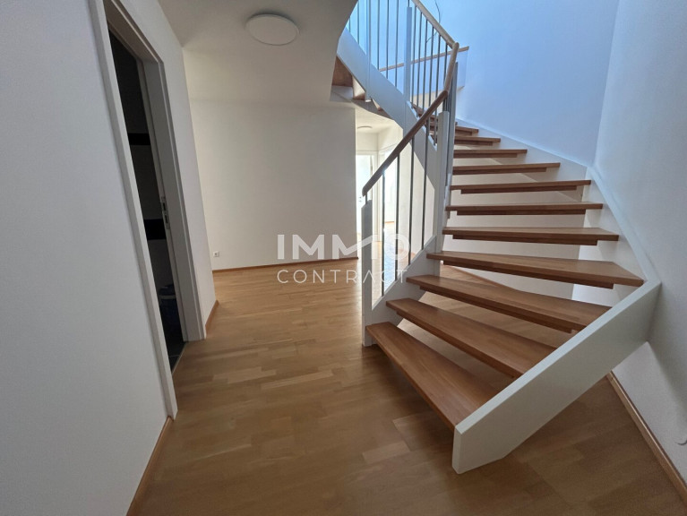 Der obere Bereich der Wohnung ist das Herzstück des Hauses: Ein offener Wohn- und Essbereich mit vorgesehener Küchenecke lädt zum gemütlichen Beisammensein ein. Von hier aus gelangt man auf die sonnige Terrasse, die zum Entspannen im Freien einlädt und einen schönen Ausblick bietet.