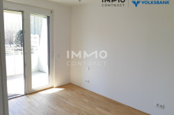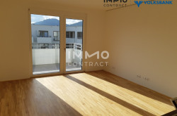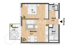Vom Wohnungseingang gelangt man in die Garderobe mit direktem Zugang zum Badezimmer, zum WC und zum Wohnbereich. Dieser ist mit einer Einbauküche sowie Platz für Essen und Wohnen ausgestattet. Zudem erfolgt der Zugang zum Schlafzimmer über diese Räumlichkeit. Der Wohnbereich verfügt über Fenstertüren zum Balkon.