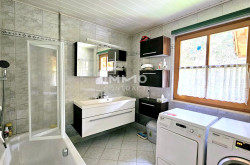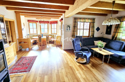 Das Erdgeschoß besteht aus einem großzügigen Wohn-/Esszimmer mit Specksteinofen, moderner Küche, Gästezimmer, Bad mit Badewanne, Gäste WC und Vorzimmer.