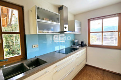 Der idyllische, pflegeleichte Garten ist nach Süden ausgerichtet und bietet einen grandiosen Blick über die umliegenden Berge.