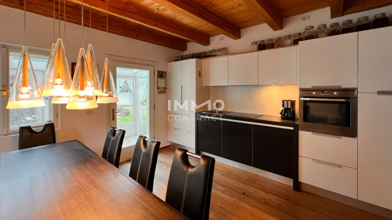 Das Haus wurde mit spürbarer Sorgfalt saniert: Dach, Heizung, Leitungen, Böden und Bäder sind erneuert, und die Küche im italienischen Stil verleiht dem Erdgeschoss eine besondere Leichtigkeit. Das Wohnzimmer mit Essbereich, offenem Kamin sowie den erneuerten Holzbalkendecken und der frischen Vertäfelung strahlt jene natürliche Wärme aus, die sofort Geborgenheit schafft.