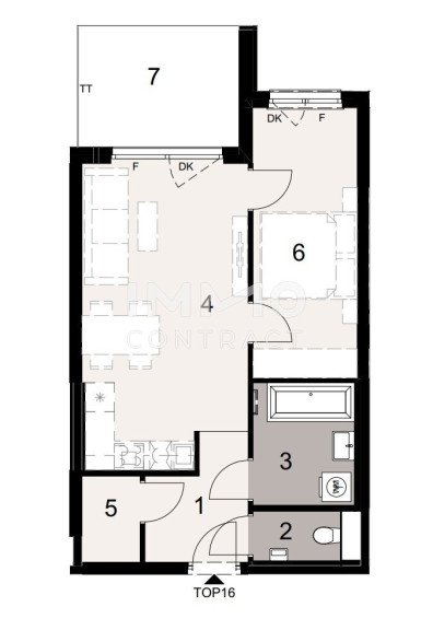 Der offene Wohn-Essbereich mit moderner Küche lädt zum Verweilen ein und öffnet sich auf die gemütliche Loggia – perfekt für den ersten Kaffee am Morgen oder einen ruhigen Abend im Freien. Das Schlafzimmer bietet ausreichend Platz und sorgt mit seinem klaren Schnitt für ein harmonisches Wohngefühl.