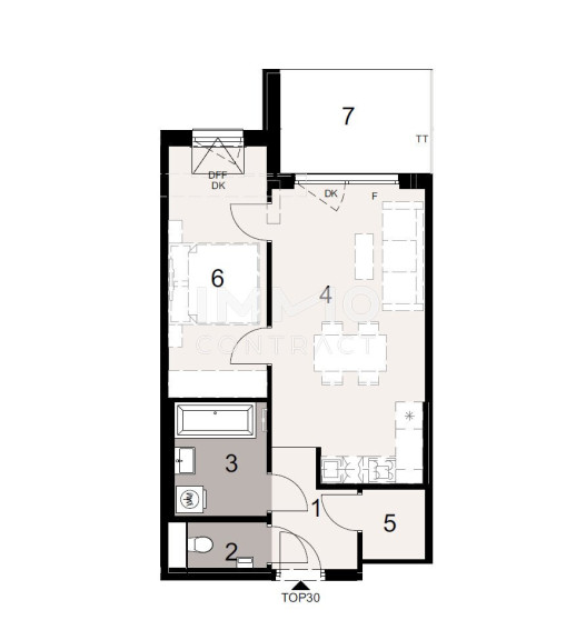 Der offene Wohnbereich mit Küche ist perfekt, um Freunde einzuladen, gemeinsam zu kochen oder einfach zu entspannen. Durch die großen Fenster wirkt der Raum hell und offen – ideal, um Ihren eigenen Stil einzubringen.