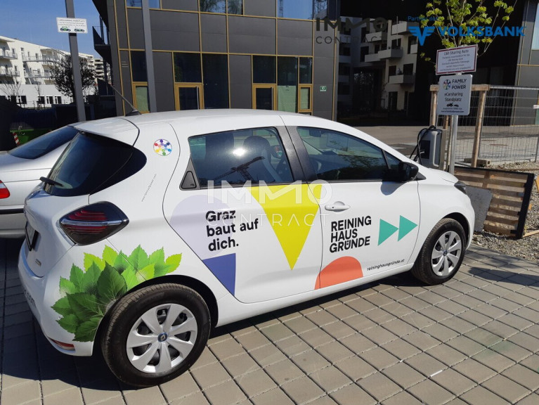 Ein zukunftsweisendes Mobilitätskonzept baut den öffentlichen Verkehr aus und investiert in die E-Mobilität mit E-Car-Sharing direkt vor dem Gebäude.