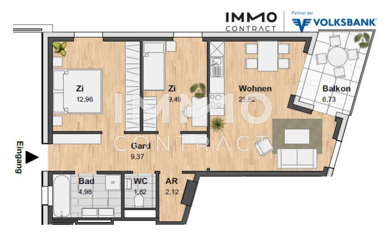 Vom Wohnungseingang gelangt man in die Garderobe mit direktem Zugang zum WC mit Waschbecken, zum Bad mit Wanne und Doppelwaschbecken und zum Abstellraum. Vom Gang/Garderobe erreicht man auch die 2 Schlafzimmer und den Wohnbereich. Dieser ist mit einer Einbauküche sowie Platz für Essen und Wohnen ausgestattet. Der Wohnbereich verfügt über Fenstertüren zum Balkon.