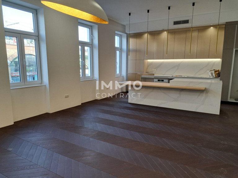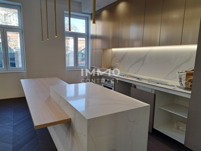 Das Highlight ist das große Wohnzimmer mit Einbauten und die Luxusküche mit Frühstücksbar. Sie hören hier keine Verkehrsgeräusche, da eigene Schallschutzfenster eingebaut sind.