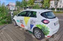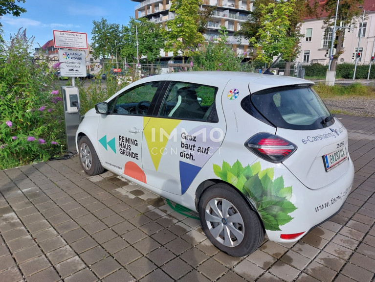Ein zukunftsweisendes Mobilitätskonzept baut den öffentlichen Verkehr aus und investiert in die E-Mobilität mit E-Car-Sharing direkt vor dem Gebäude.