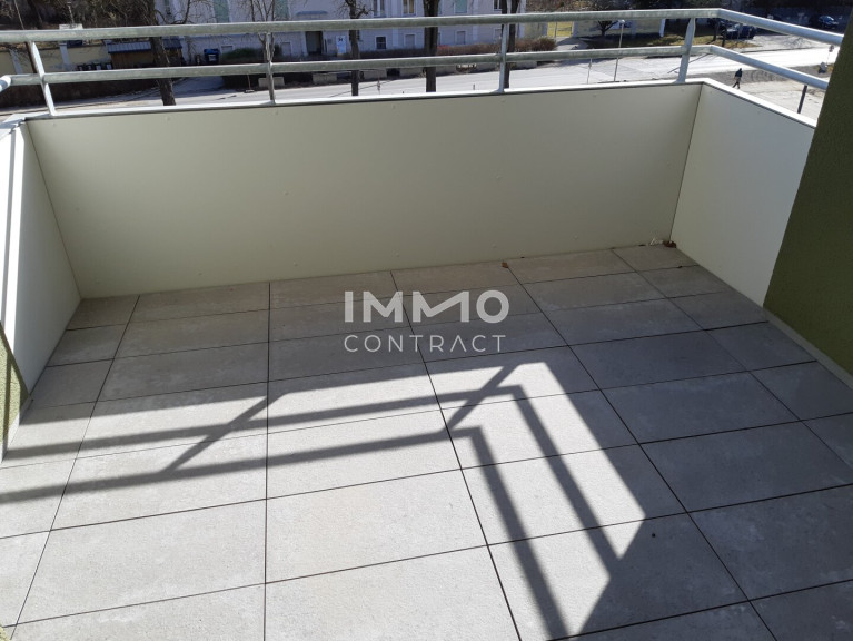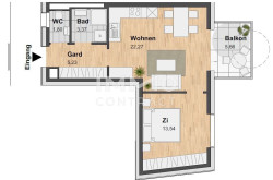 Vom Wohnungseingang gelangt man in die Garderobe mit direktem Zugang zum Badezimmer, zum WC mit Fenster und zum Wohnbereich. Dieser ist mit einer Einbauküche sowie Platz für Essen und Wohnen ausgestattet. Vom Wohnzimmer gelangt man ins Schlafzimmer. Der Wohnbereich verfügt über Fenstertüren zum Balkon.