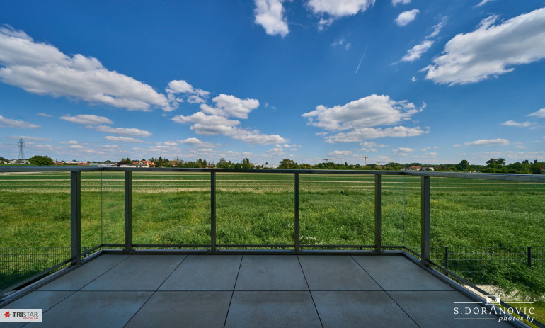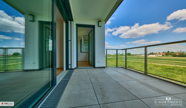 Die Wohnung Top 4 ist ideal ausgerichtet: sowohl von beiden Zimmern als auch vom Balkon – der direkt von der Wohnküche aus begehbar ist –genießen Sie einen wunderbaren Blick auf das angrenzende grüne Feld sowie eine perfekte Himmelsausrichtung!