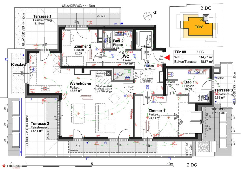 TOP 8: 3 Zimmer, ca. 115 m² + Terrasse 1 ca. 19,18 m² + Terrasse 2 ca. 33,41 m² + Terrasse 3 ca. 6 m² = EUR 1.089.900 -