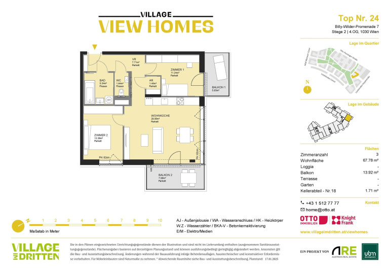 Dank der Nähe zur S-Bahn-Haltestelle St. Marx, der Straßenbahnlinie 18 und weiteren öffentlichen Verkehrsmitteln sowie dem Autobahnanschluss an die A23 ist VIEW HOMES sehr gut an das öffentliche Verkehrsnetz angebunden: So ist etwa der Hauptbahnhof nur sieben Minuten mit der Straßenbahn entfernt. Ebenso wird mit der Verlängerung der Straßenbahnlinie 18 von der U3-Station Schlachthausgasse zur U2-Station Stadion bis Herbst 2026 eine neue Direktverbindung in den grünen Prater geschaffen. Ein optimaler Standort zum Leben. Die Billy-Wilder-Promenade befindet sich am südöstlichen Kopfende des neu errichteten zentralen Bert-Brecht-Parks. Moderne Einkaufs-, Freizeit- und Gastronomieflächen erwarten Sie in fußläufiger Entfernung in den Erdgeschoßzonen des gesamten Quartiers und in den DOCKS am Landstraßer Gürtel.Beschreibung der Immobilie
