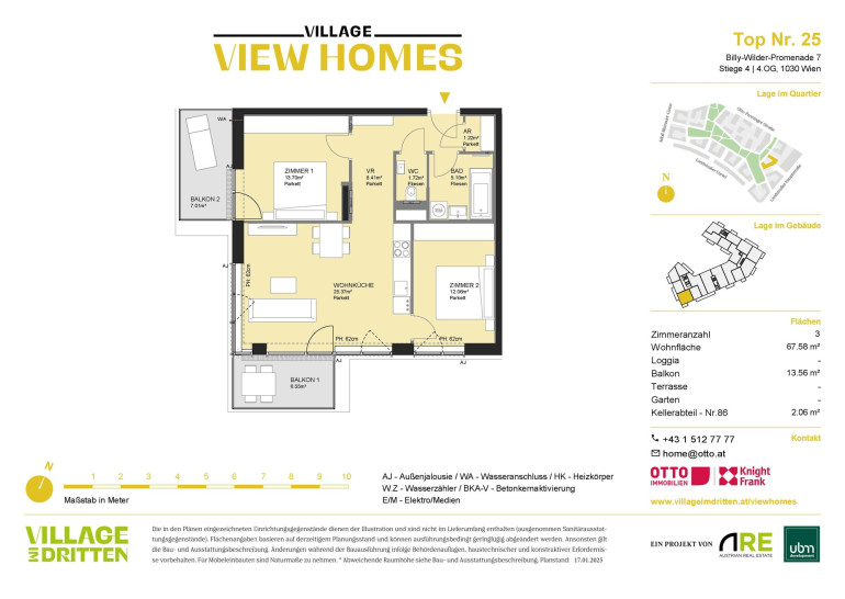 Dank der Nähe zur S-Bahn-Haltestelle St. Marx, der Straßenbahnlinie 18 und weiteren öffentlichen Verkehrsmitteln sowie dem Autobahnanschluss an die A23 ist VIEW HOMES sehr gut an das öffentliche Verkehrsnetz angebunden: So ist etwa der Hauptbahnhof nur sieben Minuten mit der Straßenbahn entfernt. Ebenso wird mit der Verlängerung der Straßenbahnlinie 18 von der U3-Station Schlachthausgasse zur U2-Station Stadion bis Herbst 2026 eine neue Direktverbindung in den grünen Prater geschaffen. Ein optimaler Standort zum Leben. Die Billy-Wilder-Promenade befindet sich am südöstlichen Kopfende des neu errichteten zentralen Bert-Brecht-Parks. Moderne Einkaufs-, Freizeit- und Gastronomieflächen erwarten Sie in fußläufiger Entfernung in den Erdgeschoßzonen des gesamten Quartiers und in den DOCKS am Landstraßer Gürtel.Beschreibung der Immobilie