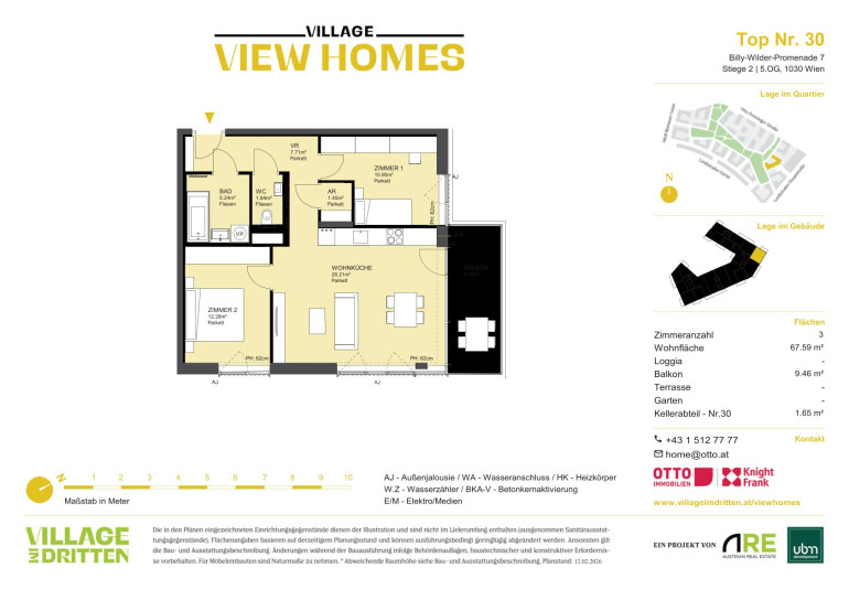 Dank der Nähe zur S-Bahn-Haltestelle St. Marx, der Straßenbahnlinie 18 und weiteren öffentlichen Verkehrsmitteln sowie dem Autobahnanschluss an die A23 ist VIEW HOMES sehr gut an das öffentliche Verkehrsnetz angebunden: So ist etwa der Hauptbahnhof nur sieben Minuten mit der Straßenbahn entfernt. Ebenso wird mit der Verlängerung der Straßenbahnlinie 18 von der U3-Station Schlachthausgasse zur U2-Station Stadion bis Herbst 2026 eine neue Direktverbindung in den grünen Prater geschaffen. Ein optimaler Standort zum Leben. Die Billy-Wilder-Promenade befindet sich am südöstlichen Kopfende des neu errichteten zentralen Bert-Brecht-Parks. Moderne Einkaufs-, Freizeit- und Gastronomieflächen erwarten Sie in fußläufiger Entfernung in den Erdgeschoßzonen des gesamten Quartiers und in den DOCKS am Landstraßer Gürtel.Beschreibung der Immobilie