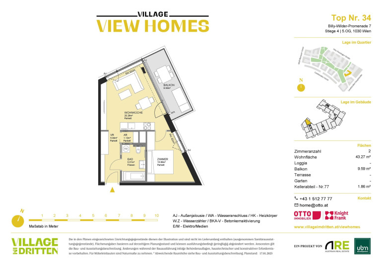 Dank der Nähe zur S-Bahn-Haltestelle St. Marx, der Straßenbahnlinie 18 und weiteren öffentlichen Verkehrsmitteln sowie dem Autobahnanschluss an die A23 ist VIEW HOMES sehr gut an das öffentliche Verkehrsnetz angebunden: So ist etwa der Hauptbahnhof nur sieben Minuten mit der Straßenbahn entfernt. Ebenso wird mit der Verlängerung der Straßenbahnlinie 18 von der U3-Station Schlachthausgasse zur U2-Station Stadion bis Herbst 2026 eine neue Direktverbindung in den grünen Prater geschaffen. Ein optimaler Standort zum Leben. Die Billy-Wilder-Promenade befindet sich am südöstlichen Kopfende des neu errichteten zentralen Bert-Brecht-Parks. Moderne Einkaufs-, Freizeit- und Gastronomieflächen erwarten Sie in fußläufiger Entfernung in den Erdgeschoßzonen des gesamten Quartiers und in den DOCKS am Landstraßer Gürtel.Beschreibung der Immobilie
