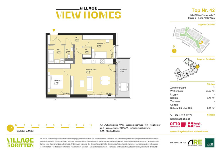 Dank der Nähe zur S-Bahn-Haltestelle St. Marx, der Straßenbahnlinie 18 und weiteren öffentlichen Verkehrsmitteln sowie dem Autobahnanschluss an die A23 ist VIEW HOMES sehr gut an das öffentliche Verkehrsnetz angebunden: So ist etwa der Hauptbahnhof nur sieben Minuten mit der Straßenbahn entfernt. Ebenso wird mit der Verlängerung der Straßenbahnlinie 18 von der U3-Station Schlachthausgasse zur U2-Station Stadion bis Herbst 2026 eine neue Direktverbindung in den grünen Prater geschaffen. Ein optimaler Standort zum Leben. Die Billy-Wilder-Promenade befindet sich am südöstlichen Kopfende des neu errichteten zentralen Bert-Brecht-Parks. Moderne Einkaufs-, Freizeit- und Gastronomieflächen erwarten Sie in fußläufiger Entfernung in den Erdgeschoßzonen des gesamten Quartiers und in den DOCKS am Landstraßer Gürtel.Beschreibung der Immobilie