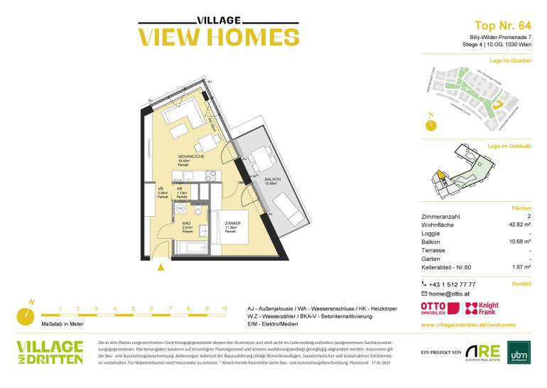 Dank der Nähe zur S-Bahn-Haltestelle St. Marx, der Straßenbahnlinie 18 und weiteren öffentlichen Verkehrsmitteln sowie dem Autobahnanschluss an die A23 ist VIEW HOMES sehr gut an das öffentliche Verkehrsnetz angebunden: So ist etwa der Hauptbahnhof nur sieben Minuten mit der Straßenbahn entfernt. Ebenso wird mit der Verlängerung der Straßenbahnlinie 18 von der U3-Station Schlachthausgasse zur U2-Station Stadion bis Herbst 2026 eine neue Direktverbindung in den grünen Prater geschaffen. Ein optimaler Standort zum Leben. Die Billy-Wilder-Promenade befindet sich am südöstlichen Kopfende des neu errichteten zentralen Bert-Brecht-Parks. Moderne Einkaufs-, Freizeit- und Gastronomieflächen erwarten Sie in fußläufiger Entfernung in den Erdgeschoßzonen des gesamten Quartiers und in den DOCKS am Landstraßer Gürtel.Beschreibung der Immobilie
