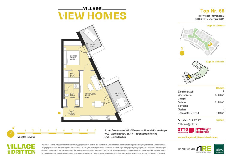 Dank der Nähe zur S-Bahn-Haltestelle St. Marx, der Straßenbahnlinie 18 und weiteren öffentlichen Verkehrsmitteln sowie dem Autobahnanschluss an die A23 ist VIEW HOMES sehr gut an das öffentliche Verkehrsnetz angebunden: So ist etwa der Hauptbahnhof nur sieben Minuten mit der Straßenbahn entfernt. Ebenso wird mit der Verlängerung der Straßenbahnlinie 18 von der U3-Station Schlachthausgasse zur U2-Station Stadion bis Herbst 2026 eine neue Direktverbindung in den grünen Prater geschaffen. Ein optimaler Standort zum Leben. Die Billy-Wilder-Promenade befindet sich am südöstlichen Kopfende des neu errichteten zentralen Bert-Brecht-Parks. Moderne Einkaufs-, Freizeit- und Gastronomieflächen erwarten Sie in fußläufiger Entfernung in den Erdgeschoßzonen des gesamten Quartiers und in den DOCKS am Landstraßer Gürtel.Beschreibung der Immobilie