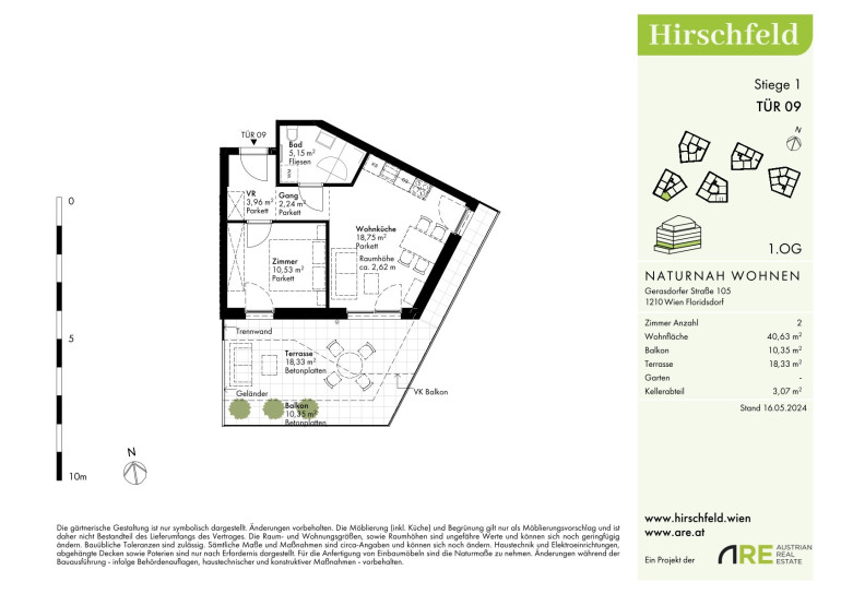 Das Hirschfeld ist ein ruhiges Viertel am Stadtrand von Wien. Die Großstadt im Rücken verspricht jedem Heimkehrenden ein Naturerlebnis und Entspannung. Wer die Wiener Linien nutzt, nimmt am besten die Buslinie 32A von der Kollarzgasse bis zum U- und S-Bahn-Knotenpunkt Leopoldau. Von hier aus bieten die U1 in Richtung Zentrum sowie die Schnellbahnlinien S1, S2 und S7 schnelle Verbindungen in und aus der Stadt. Alternativ verläuft die Straßenbahnlinie 31 entlang der Brünner Straße über Floridsdorf direkt bis zum Schottenring. Autofahrer profitieren von der nahegelegenen A22.Beschreibung der Immobilie