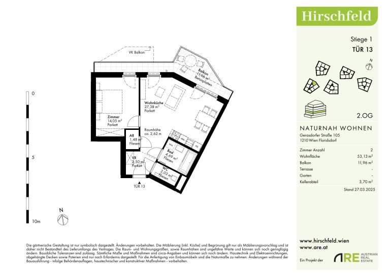 Das Hirschfeld ist ein ruhiges Viertel am Stadtrand von Wien. Die Großstadt im Rücken verspricht jedem Heimkehrenden ein Naturerlebnis und Entspannung. Wer die Wiener Linien nutzt, nimmt am besten die Buslinie 32A von der Kollarzgasse bis zum U- und S-Bahn-Knotenpunkt Leopoldau. Von hier aus bieten die U1 in Richtung Zentrum sowie die Schnellbahnlinien S1, S2 und S7 schnelle Verbindungen in und aus der Stadt. Alternativ verläuft die Straßenbahnlinie 31 entlang der Brünner Straße über Floridsdorf direkt bis zum Schottenring. Autofahrer profitieren von der nahegelegenen A22.Beschreibung der Immobilie