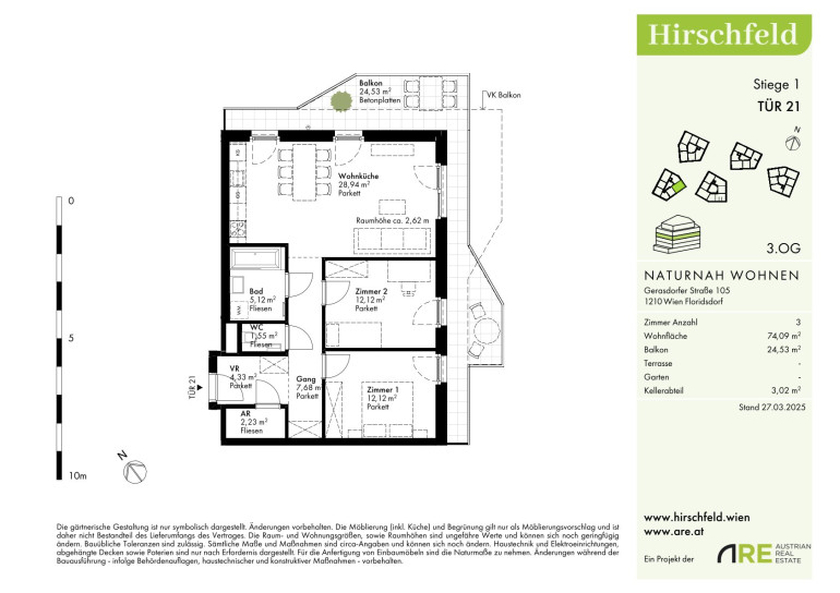 Das Hirschfeld ist ein ruhiges Viertel am Stadtrand von Wien. Die Großstadt im Rücken verspricht jedem Heimkehrenden ein Naturerlebnis und Entspannung. Wer die Wiener Linien nutzt, nimmt am besten die Buslinie 32A von der Kollarzgasse bis zum U- und S-Bahn-Knotenpunkt Leopoldau. Von hier aus bieten die U1 in Richtung Zentrum sowie die Schnellbahnlinien S1, S2 und S7 schnelle Verbindungen in und aus der Stadt. Alternativ verläuft die Straßenbahnlinie 31 entlang der Brünner Straße über Floridsdorf direkt bis zum Schottenring. Autofahrer profitieren von der nahegelegenen A22.Beschreibung der Immobilie