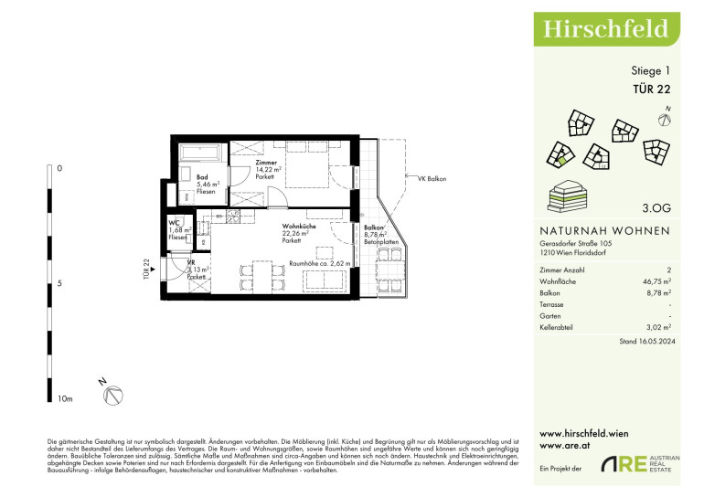 Das Hirschfeld ist ein ruhiges Viertel am Stadtrand von Wien. Die Großstadt im Rücken verspricht jedem Heimkehrenden ein Naturerlebnis und Entspannung. Wer die Wiener Linien nutzt, nimmt am besten die Buslinie 32A von der Kollarzgasse bis zum U- und S-Bahn-Knotenpunkt Leopoldau. Von hier aus bieten die U1 in Richtung Zentrum sowie die Schnellbahnlinien S1, S2 und S7 schnelle Verbindungen in und aus der Stadt. Alternativ verläuft die Straßenbahnlinie 31 entlang der Brünner Straße über Floridsdorf direkt bis zum Schottenring. Autofahrer profitieren von der nahegelegenen A22.Beschreibung der Immobilie