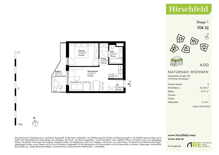 Das Hirschfeld ist ein ruhiges Viertel am Stadtrand von Wien. Die Großstadt im Rücken verspricht jedem Heimkehrenden ein Naturerlebnis und Entspannung. Wer die Wiener Linien nutzt, nimmt am besten die Buslinie 32A von der Kollarzgasse bis zum U- und S-Bahn-Knotenpunkt Leopoldau. Von hier aus bieten die U1 in Richtung Zentrum sowie die Schnellbahnlinien S1, S2 und S7 schnelle Verbindungen in und aus der Stadt. Alternativ verläuft die Straßenbahnlinie 31 entlang der Brünner Straße über Floridsdorf direkt bis zum Schottenring. Autofahrer profitieren von der nahegelegenen A22.Beschreibung der Immobilie