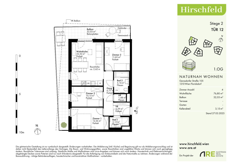 Das Hirschfeld ist ein ruhiges Viertel am Stadtrand von Wien. Die Großstadt im Rücken verspricht jedem Heimkehrenden ein Naturerlebnis und Entspannung. Wer die Wiener Linien nutzt, nimmt am besten die Buslinie 32A von der Kollarzgasse bis zum U- und S-Bahn-Knotenpunkt Leopoldau. Von hier aus bieten die U1 in Richtung Zentrum sowie die Schnellbahnlinien S1, S2 und S7 schnelle Verbindungen in und aus der Stadt. Alternativ verläuft die Straßenbahnlinie 31 entlang der Brünner Straße über Floridsdorf direkt bis zum Schottenring. Autofahrer profitieren von der nahegelegenen A22.Beschreibung der Immobilie