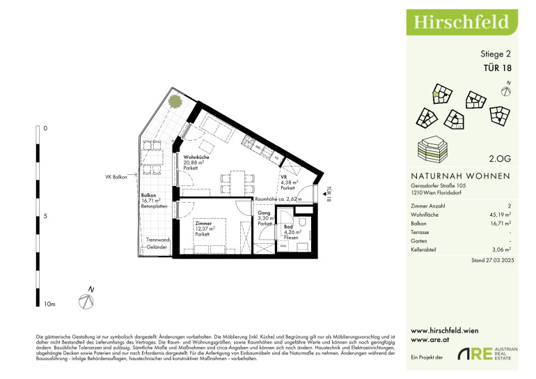 Das Hirschfeld ist ein ruhiges Viertel am Stadtrand von Wien. Die Großstadt im Rücken verspricht jedem Heimkehrenden ein Naturerlebnis und Entspannung. Wer die Wiener Linien nutzt, nimmt am besten die Buslinie 32A von der Kollarzgasse bis zum U- und S-Bahn-Knotenpunkt Leopoldau. Von hier aus bieten die U1 in Richtung Zentrum sowie die Schnellbahnlinien S1, S2 und S7 schnelle Verbindungen in und aus der Stadt. Alternativ verläuft die Straßenbahnlinie 31 entlang der Brünner Straße über Floridsdorf direkt bis zum Schottenring. Autofahrer profitieren von der nahegelegenen A22.Beschreibung der Immobilie