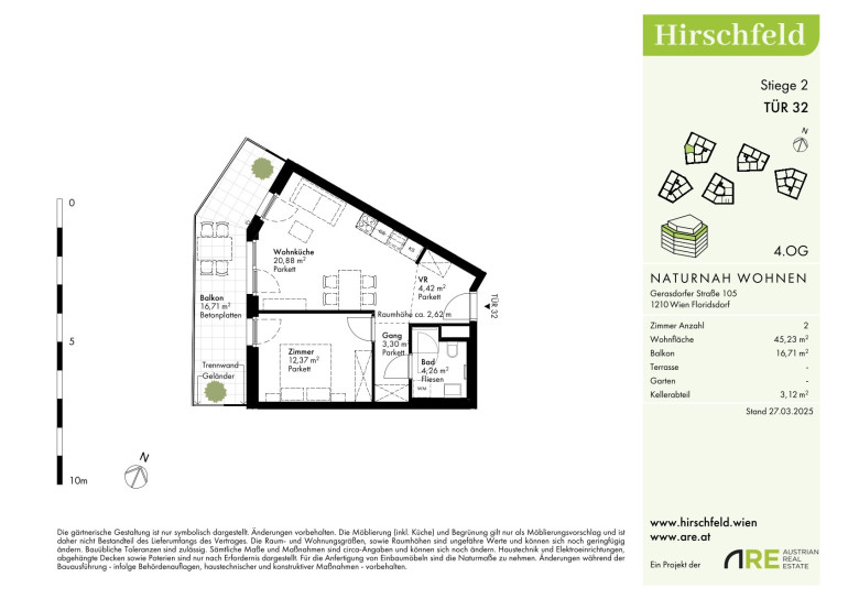 Das Hirschfeld ist ein ruhiges Viertel am Stadtrand von Wien. Die Großstadt im Rücken verspricht jedem Heimkehrenden ein Naturerlebnis und Entspannung. Wer die Wiener Linien nutzt, nimmt am besten die Buslinie 32A von der Kollarzgasse bis zum U- und S-Bahn-Knotenpunkt Leopoldau. Von hier aus bieten die U1 in Richtung Zentrum sowie die Schnellbahnlinien S1, S2 und S7 schnelle Verbindungen in und aus der Stadt. Alternativ verläuft die Straßenbahnlinie 31 entlang der Brünner Straße über Floridsdorf direkt bis zum Schottenring. Autofahrer profitieren von der nahegelegenen A22.Beschreibung der Immobilie