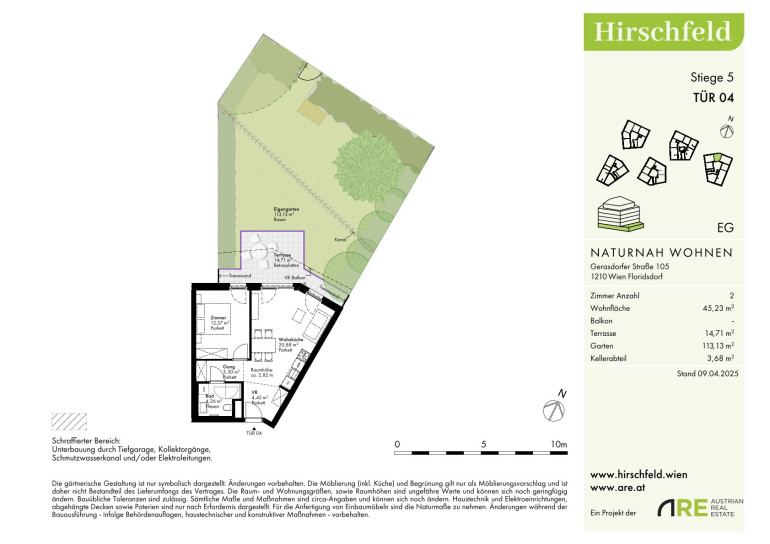 Das Hirschfeld ist ein ruhiges Viertel am Stadtrand von Wien. Die Großstadt im Rücken verspricht jedem Heimkehrenden ein Naturerlebnis und Entspannung. Wer die Wiener Linien nutzt, nimmt am besten die Buslinie 32A von der Kollarzgasse bis zum U- und S-Bahn-Knotenpunkt Leopoldau. Von hier aus bieten die U1 in Richtung Zentrum sowie die Schnellbahnlinien S1, S2 und S7 schnelle Verbindungen in und aus der Stadt. Alternativ verläuft die Straßenbahnlinie 31 entlang der Brünner Straße über Floridsdorf direkt bis zum Schottenring. Autofahrer profitieren von der nahegelegenen A22.Beschreibung der Immobilie