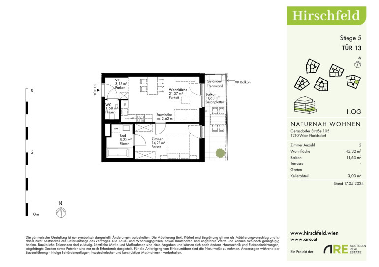 Das Hirschfeld ist ein ruhiges Viertel am Stadtrand von Wien. Die Großstadt im Rücken verspricht jedem Heimkehrenden ein Naturerlebnis und Entspannung. Wer die Wiener Linien nutzt, nimmt am besten die Buslinie 32A von der Kollarzgasse bis zum U- und S-Bahn-Knotenpunkt Leopoldau. Von hier aus bieten die U1 in Richtung Zentrum sowie die Schnellbahnlinien S1, S2 und S7 schnelle Verbindungen in und aus der Stadt. Alternativ verläuft die Straßenbahnlinie 31 entlang der Brünner Straße über Floridsdorf direkt bis zum Schottenring. Autofahrer profitieren von der nahegelegenen A22.Beschreibung der Immobilie