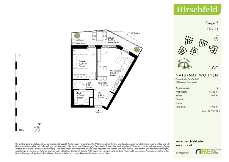 Das Hirschfeld ist ein ruhiges Viertel am Stadtrand von Wien. Die Großstadt im Rücken verspricht jedem Heimkehrenden ein Naturerlebnis und Entspannung. Wer die Wiener Linien nutzt, nimmt am besten die Buslinie 32A von der Kollarzgasse bis zum U- und S-Bahn-Knotenpunkt Leopoldau. Von hier aus bieten die U1 in Richtung Zentrum sowie die Schnellbahnlinien S1, S2 und S7 schnelle Verbindungen in und aus der Stadt. Alternativ verläuft die Straßenbahnlinie 31 entlang der Brünner Straße über Floridsdorf direkt bis zum Schottenring. Autofahrer profitieren von der nahegelegenen A22.Beschreibung der Immobilie