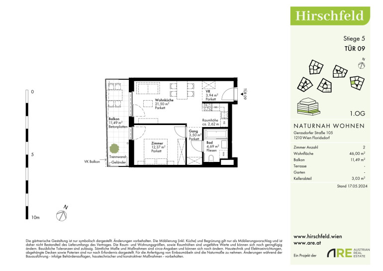 Das Hirschfeld ist ein ruhiges Viertel am Stadtrand von Wien. Die Großstadt im Rücken verspricht jedem Heimkehrenden ein Naturerlebnis und Entspannung. Wer die Wiener Linien nutzt, nimmt am besten die Buslinie 32A von der Kollarzgasse bis zum U- und S-Bahn-Knotenpunkt Leopoldau. Von hier aus bieten die U1 in Richtung Zentrum sowie die Schnellbahnlinien S1, S2 und S7 schnelle Verbindungen in und aus der Stadt. Alternativ verläuft die Straßenbahnlinie 31 entlang der Brünner Straße über Floridsdorf direkt bis zum Schottenring. Autofahrer profitieren von der nahegelegenen A22.Beschreibung der Immobilie