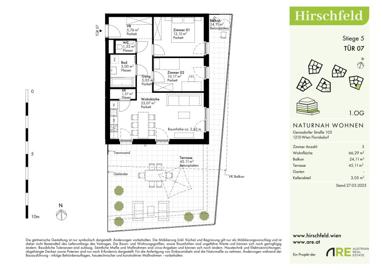 Das Hirschfeld ist ein ruhiges Viertel am Stadtrand von Wien. Die Großstadt im Rücken verspricht jedem Heimkehrenden ein Naturerlebnis und Entspannung. Wer die Wiener Linien nutzt, nimmt am besten die Buslinie 32A von der Kollarzgasse bis zum U- und S-Bahn-Knotenpunkt Leopoldau. Von hier aus bieten die U1 in Richtung Zentrum sowie die Schnellbahnlinien S1, S2 und S7 schnelle Verbindungen in und aus der Stadt. Alternativ verläuft die Straßenbahnlinie 31 entlang der Brünner Straße über Floridsdorf direkt bis zum Schottenring. Autofahrer profitieren von der nahegelegenen A22.Beschreibung der Immobilie