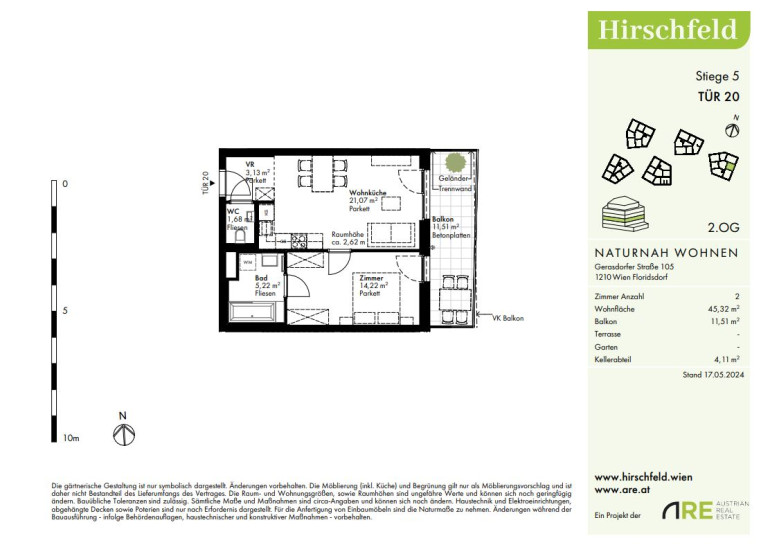 Das Hirschfeld ist ein ruhiges Viertel am Stadtrand von Wien. Die Großstadt im Rücken verspricht jedem Heimkehrenden ein Naturerlebnis und Entspannung. Wer die Wiener Linien nutzt, nimmt am besten die Buslinie 32A von der Kollarzgasse bis zum U- und S-Bahn-Knotenpunkt Leopoldau. Von hier aus bieten die U1 in Richtung Zentrum sowie die Schnellbahnlinien S1, S2 und S7 schnelle Verbindungen in und aus der Stadt. Alternativ verläuft die Straßenbahnlinie 31 entlang der Brünner Straße über Floridsdorf direkt bis zum Schottenring. Autofahrer profitieren von der nahegelegenen A22.Beschreibung der Immobilie