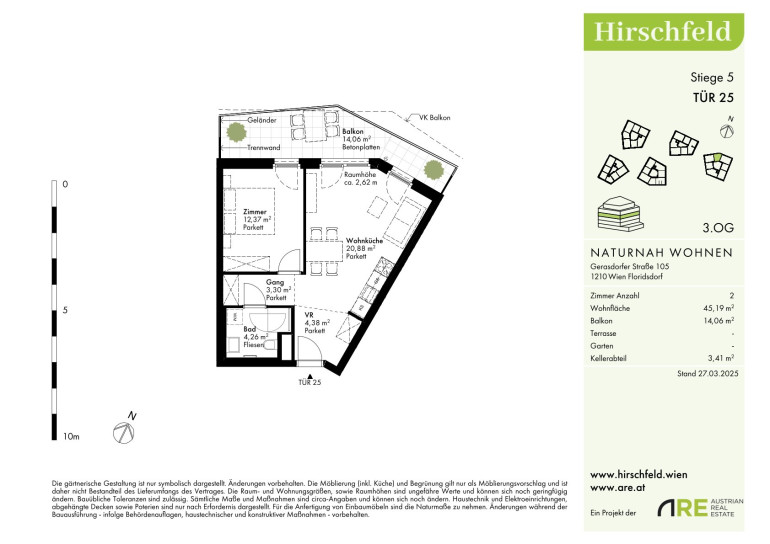 Das Hirschfeld ist ein ruhiges Viertel am Stadtrand von Wien. Die Großstadt im Rücken verspricht jedem Heimkehrenden ein Naturerlebnis und Entspannung. Wer die Wiener Linien nutzt, nimmt am besten die Buslinie 32A von der Kollarzgasse bis zum U- und S-Bahn-Knotenpunkt Leopoldau. Von hier aus bieten die U1 in Richtung Zentrum sowie die Schnellbahnlinien S1, S2 und S7 schnelle Verbindungen in und aus der Stadt. Alternativ verläuft die Straßenbahnlinie 31 entlang der Brünner Straße über Floridsdorf direkt bis zum Schottenring. Autofahrer profitieren von der nahegelegenen A22.Beschreibung der Immobilie