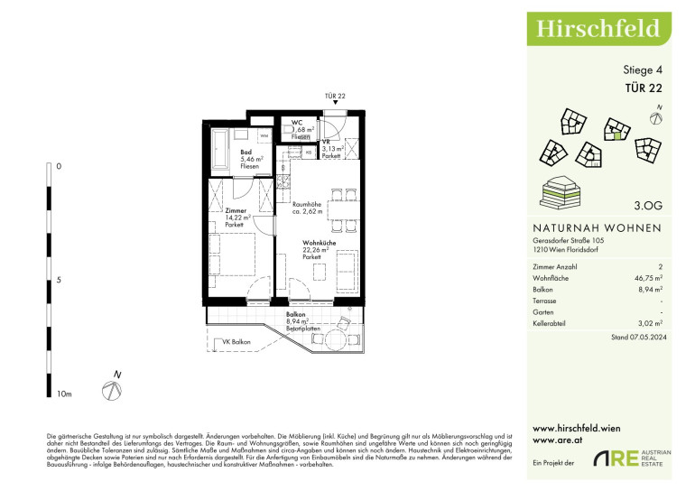 Das Hirschfeld ist ein ruhiges Viertel am Stadtrand von Wien. Die Großstadt im Rücken verspricht jedem Heimkehrenden ein Naturerlebnis und Entspannung. Wer die Wiener Linien nutzt, nimmt am besten die Buslinie 32A von der Kollarzgasse bis zum U- und S-Bahn-Knotenpunkt Leopoldau. Von hier aus bieten die U1 in Richtung Zentrum sowie die Schnellbahnlinien S1, S2 und S7 schnelle Verbindungen in und aus der Stadt. Alternativ verläuft die Straßenbahnlinie 31 entlang der Brünner Straße über Floridsdorf direkt bis zum Schottenring. Autofahrer profitieren von der nahegelegenen A22.Beschreibung der Immobilie