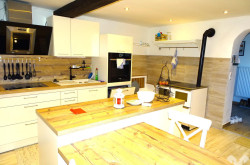 Beheizt wird das Einfamilienhaus über einen im Küchenbereich befindlichen Tischherd, der leitungsgeführt mit den Heizkörpern verbunden ist.