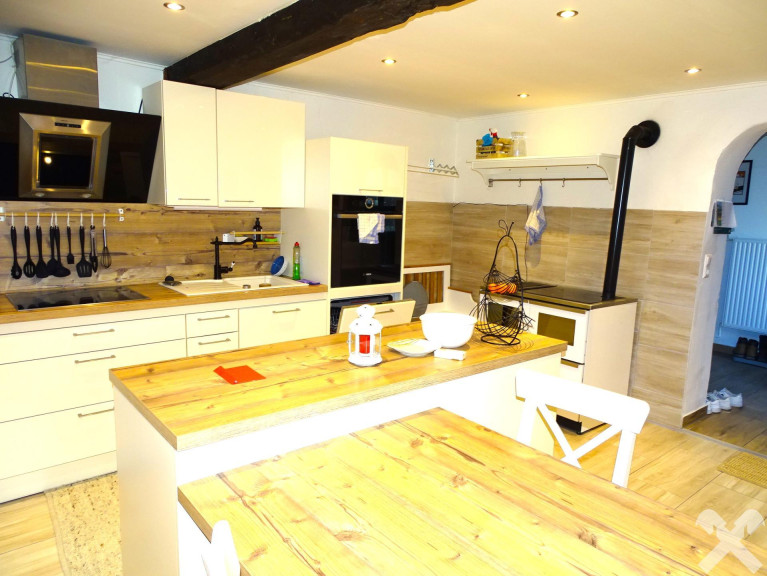 Beheizt wird das Einfamilienhaus über einen im Küchenbereich befindlichen Tischherd, der leitungsgeführt mit den Heizkörpern verbunden ist.