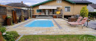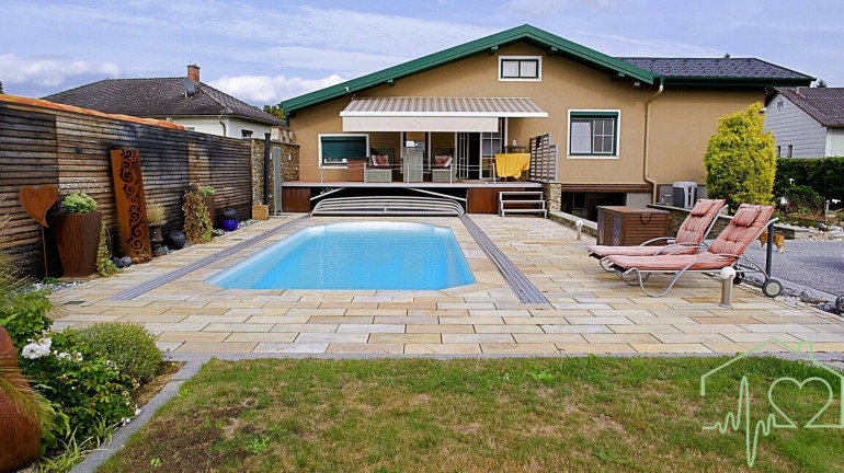 Der Poolbereich bildet das Herzstück der gepflegten Gartenlandschaft. Der beheiz- und beleuchtbare Pool hat eine moderne Überdachung, die sich platzsparend unter die Terrasse schieben lässt. Der Garten selbst begeistert mit liebevollen Details und spürbarer Ruhe: Ob beim Rückzug in eine der Sitznischen, beim Arbeiten in den Hochbeeten oder beim Abendessen im Freien – dieser Außenbereich schafft Raum für echte Lebensqualität.