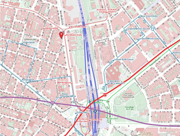 Das 1993 errichtete Bürohaus befindet sich direkt an der Nordbahnstraße, in ca. 5 Gehminuten Entfernung zum Praterstern und zur U-Bahnstation Öffentlich: - Ubahn: U1, U2 Praterstern - Bus: 80A, 82A: Station Praterstern - Straßenbahn: 5,O,2 - S-Bahn: S1, S2, S3, S5 Individualverkehr: - 10 Minuten ins Stadtzentrum über die Taborstraße oder PraterstraßeBeschreibung der Immobilie