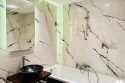 Das stilvolle Badezimmer ist mit großformatigen, marmorierten Fliesen, einer Badewanne und einem Waschtisch ausgestattet, die separate Toilette sorgt für zusätzlichen Komfort. Ein praktischer Abstellraum sowie ein zentraler Vorraum bieten großzügigen Stauraum.