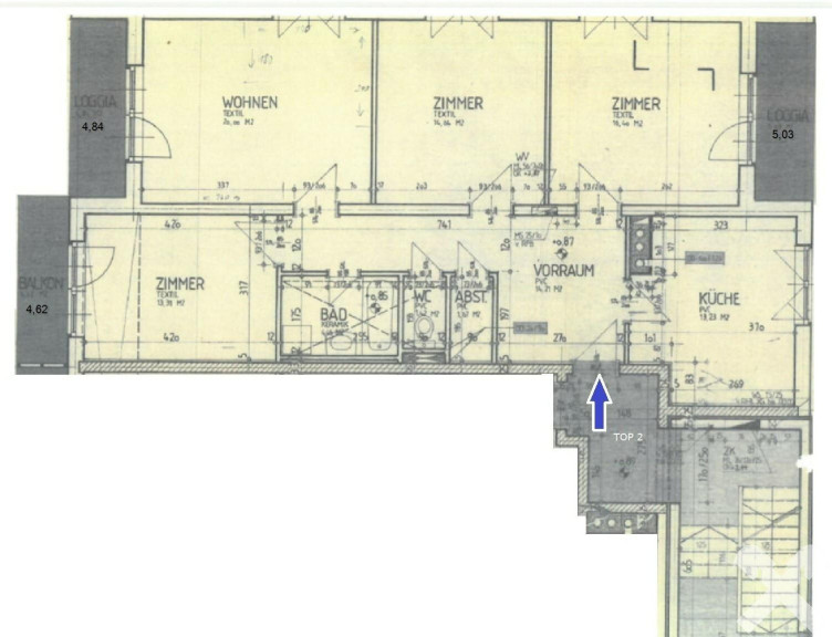 Vorraum, Küche, Abstellraum, WC, Bad, Zimmer mit Balkon, Wohnzimmer mit Loggia, Zimmer, Zimmer mit Loggia