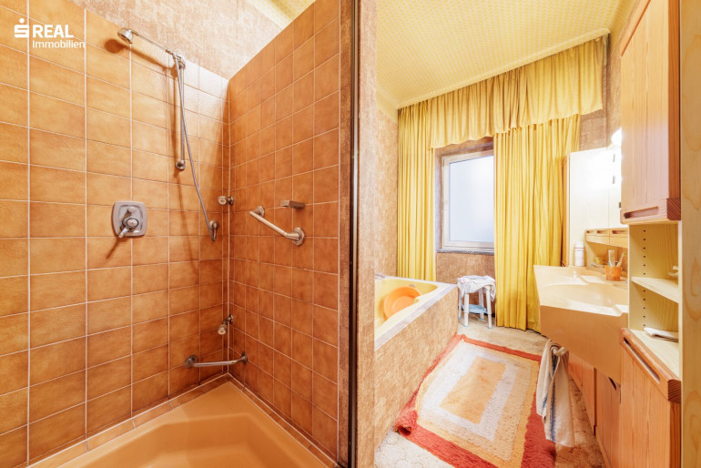 Fliesen, Kunststoffboden, Teppichboden, Parkett, Bad mit Fenster, Badewanne, Dusche