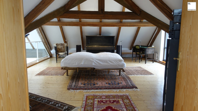 Beim Ausbau des Hofes 1991-1993 wurde das Dach zur Gänze entfernt und mit alten gehackten Balken neu aufgebaut und isoliert. Über eine Wendeltreppe gelangt man auf eine Brücke im Obergeschoss, die zwei große Räume miteinander verbindet. Der Dachausbau beherbergt außerdem ein WC und einen begehbaren Schrank. Der Wintergarten ist über den zwei- geschossigen Luftraum mit dem westlichen Schlafraum verbunden und gibt vom Bett freien Blick auf Wiesen und Wälder Richtung Norden und Süden.