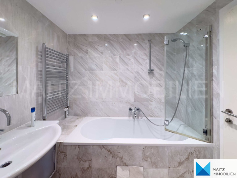 + Bad mit Wanne; Handtuchheizkörper, Waschtisch mit Unterbau; Toilette