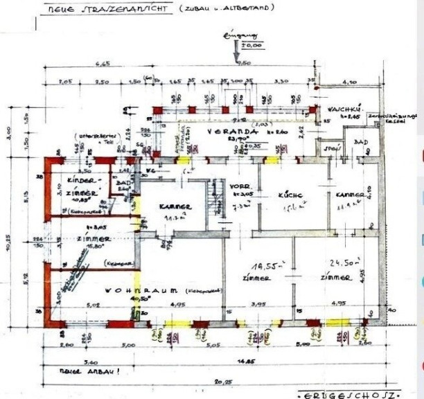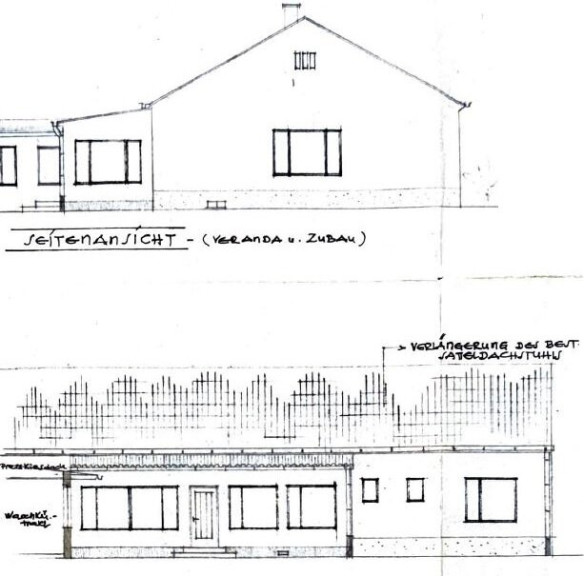 Der Altbestand ist ca. 1942 errichtet und hat eine Deckenhöhe von ca. 3,20m. Die Raumhöhe verleiht den Zimmern ein Palaisartiges Ambiente und öffnet neue Ideen für den Umbau / Modernisierung. 1949 wurde das Haus um eine Waschküche, Aufenthaltsraum, Dusche, Abstellraum, ein zusätzliches Schlafzimmer und einer Garage / Werkstatt erweitert. Im Jahre 1967 wurde der Keller zum Wohnhaus erweitert und die Veranda (24m2), sowie ein weiteres Bad, und zwei Zimmer als Zubau neu errichtet. Im Jahr 1990 wurden die Fenster und die Elektrik getauscht und einiges am Haus gemacht. Es wurde laufend instandgesetzt und das Haus wirkt immer noch sehr gepflegt und bewohnbar.