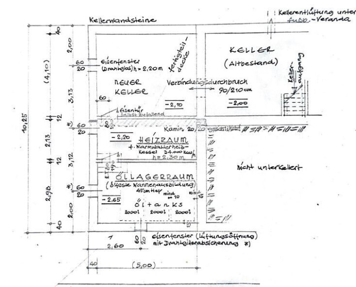 Im Keller können Sie einen Hobbyraum machen, zusätzlich gibt es den Heizraum wo die Ölzentralheizung untergebracht ist, daneben ein Raum (Öllagerraum mit zwei Tanks von jeweils 2000 Liter), und ein weiterer Lagerraum. Geheizt wird mittels einer Ölzentralheizung. Im Keller ist zusätzlich ein Anschluss für Gas verlegt worden. Zusätzlich gibt es noch zwei Kamine die überprüft werden müssten für die erneute Inbetreibnahme.