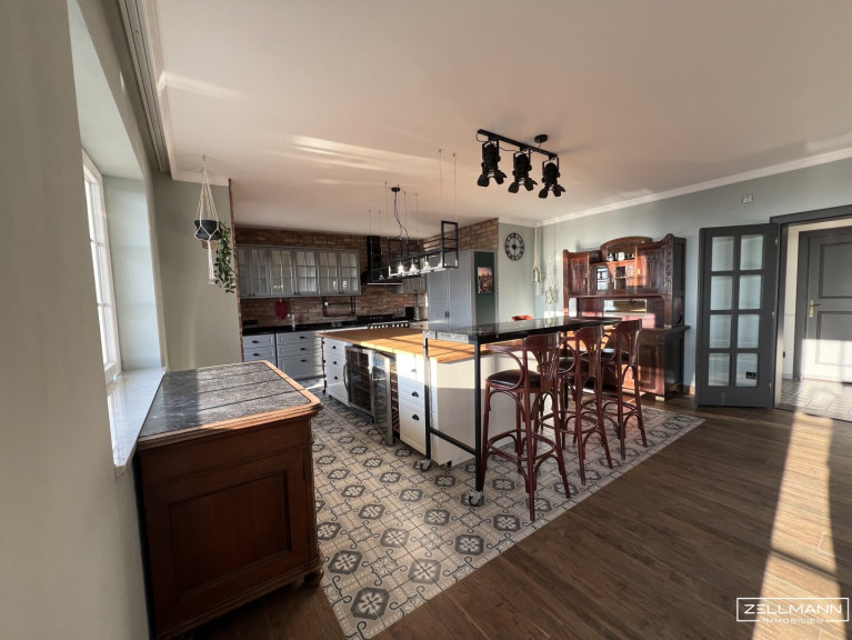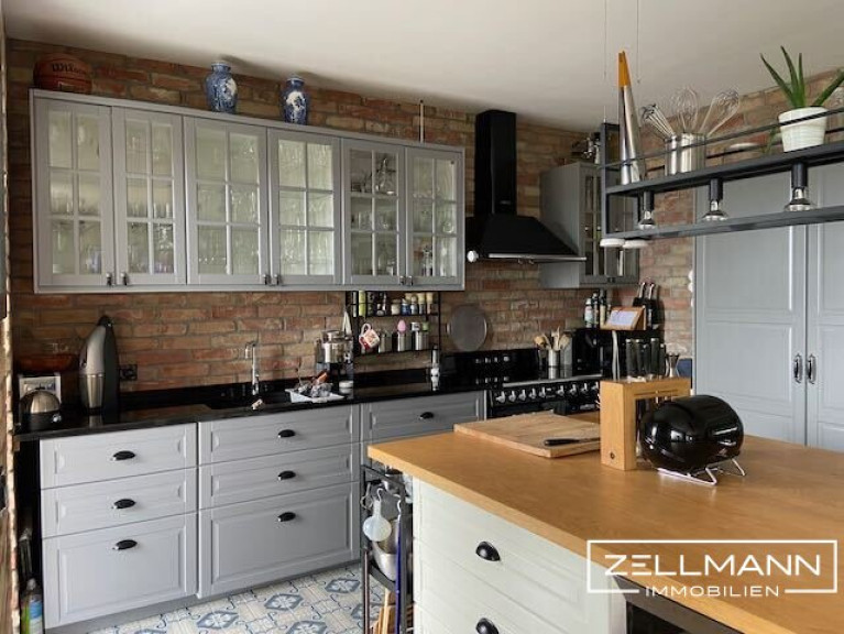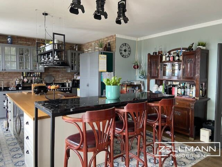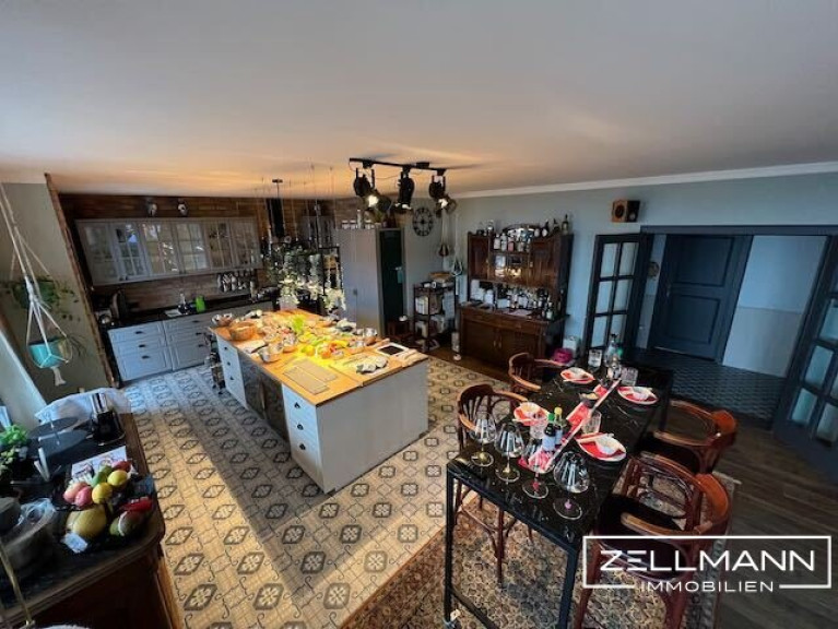 Der Essbereich ist als eigener, atmosphärischer Mittelpunkt gestaltet – ideal für lange Abende, Familienfeste oder repräsentative Einladungen. Die Küche präsentiert sich als funktionaler wie kommunikativer Raum, hochwertig ausgestattet und klar strukturiert.