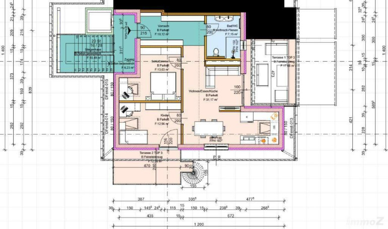 Das Raumaufteilung ist wie folgt, Vorraum, Bad mit WC, 2 Schlafzimmer und offenes Wohn.- Esszimmer und angrenzenden rund 29 m² großen Balkon